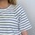 Basis t-shirt i creme/blå stribet rib fra Leveté Room. T-shirten er designet i en lækker blød økologisk bomuld med striber og har stræk i materialet. Derudover har den rund halsudskæring med en smal ribkant og et broderet logo i nakken. Ærmerne er korte med en lille smule puf samt små rynker på skuldrene.