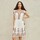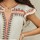 Skøn kjole i bomuld med foer forneden fra M.A.B.E. Kjolen har kinakrave samt v-hals og korte skrå ærmer. Derudover har den løbegang i taljen med snøre, som bindes i hver side. Snøren afsluttes med farverige kvaster. Kjolen har det fineste broderede mønster i skønne farver og blondebånd forneden samt nederst på ærmerne.